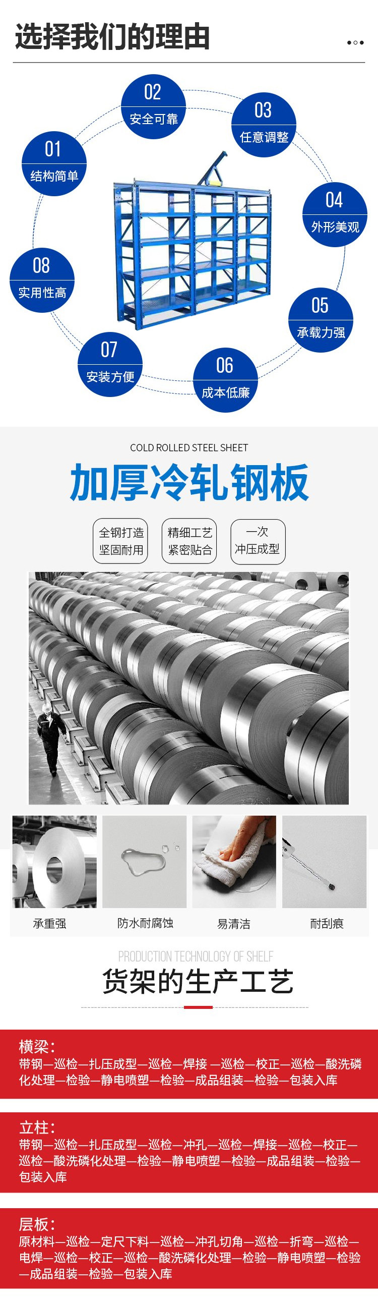 產(chǎn)品描述:模具貨架是貨架的一種,簡稱:模具架。主要存放各種模具物品,根據(jù)承載能力要求分為輕型模具貨架和重型模具貨架。貨架頂部可配置移動葫蘆車,以方便模具的起吊。