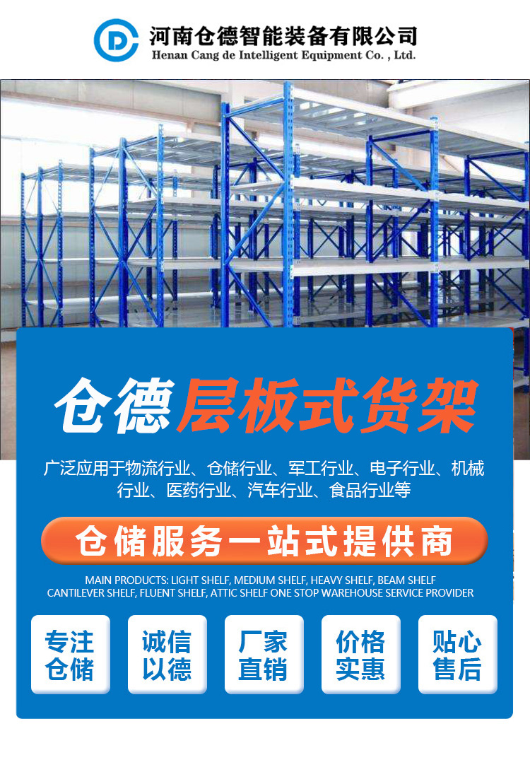 產(chǎn)品描述:層板貨架,是由立柱,橫梁和層板(托盤)組成,被廣泛應(yīng)用于制造業(yè)、第三方物流和配送中心等領(lǐng)域。