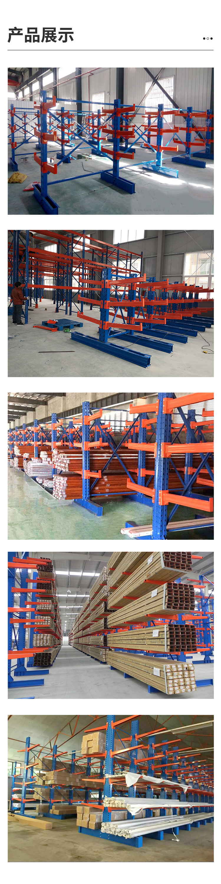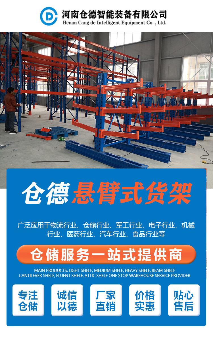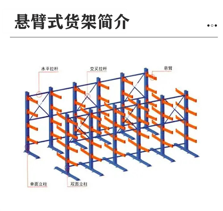 產(chǎn)品描述:懸臂式貨架是貨架中重要的一種。懸臂式貨架適用于存放長(zhǎng)物料、環(huán)型物料、板材、管材及不規(guī)則貨物。懸臂可以是單面或雙面,懸臂式貨架具有結(jié)構(gòu)穩(wěn)定,載重能力好、空間利用率高等特點(diǎn)。懸臂式貨架立柱多采用H型鋼或冷軋型鋼,懸臂采用方管、冷軋型鋼或H型鋼,懸臂與立柱間采用插接式或螺栓連接式,底座與立柱間采用螺栓連接式,底座采用冷軋型鋼或H型鋼。