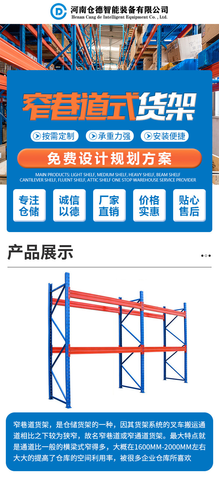 產(chǎn)品描述:窄巷道貨架,是倉(cāng)儲(chǔ)貨架的一種,因其貨架系統(tǒng)的叉車搬運(yùn)通道相比之下較為狹窄,故名窄巷道或窄通道貨架。